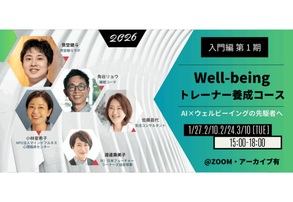 本コースは、AI教育者である笹埜健斗氏をメイン講師に、特別ゲストとしてベストセラー『働くあなたの快眠地図』著者の角谷リョウ氏、臨床心理士の小林亜希子氏をお迎えし、さらにナビゲーターの佐藤昌代氏(気活コンサルタント)、ラーニングサポーターの渡邊壽美子も加わった体制で進行してまいりました。